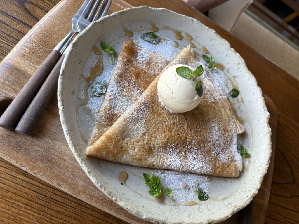クレープは優しい甘さで、朝の空気と相まって贅沢なひとときになりました。