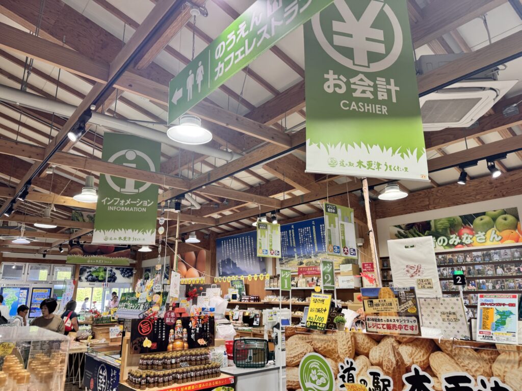 建物に入ると新鮮な野菜の香りとピーナッツの甘い匂いが広がり、道の駅ならではの地元の賑やかさを感じられます。