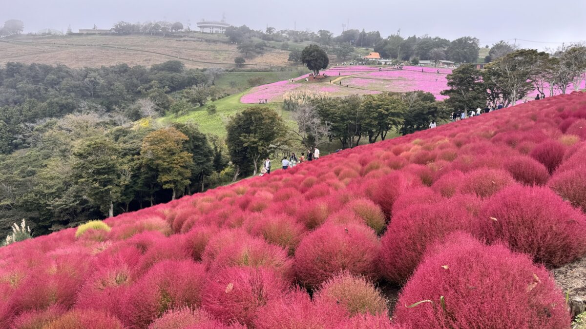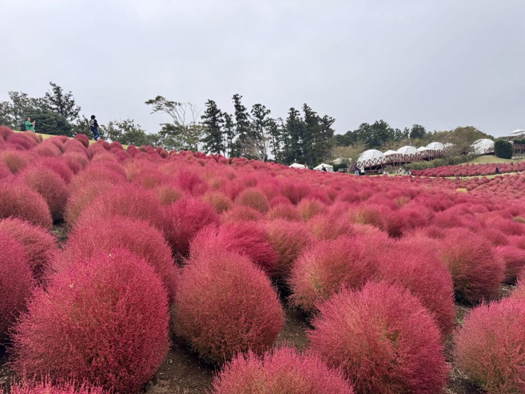広大な敷地いっぱいに広がるコキアが見頃を迎え、どこまでも続く赤い絨毯のような景色が楽しめる季節です。