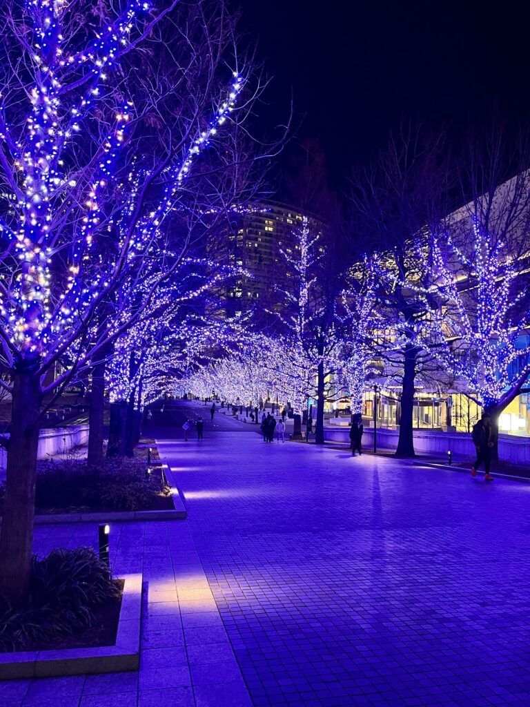 高層ビルの光と街路樹のライトアップが調和して、シンプルながら上品な輝きを放ちます。